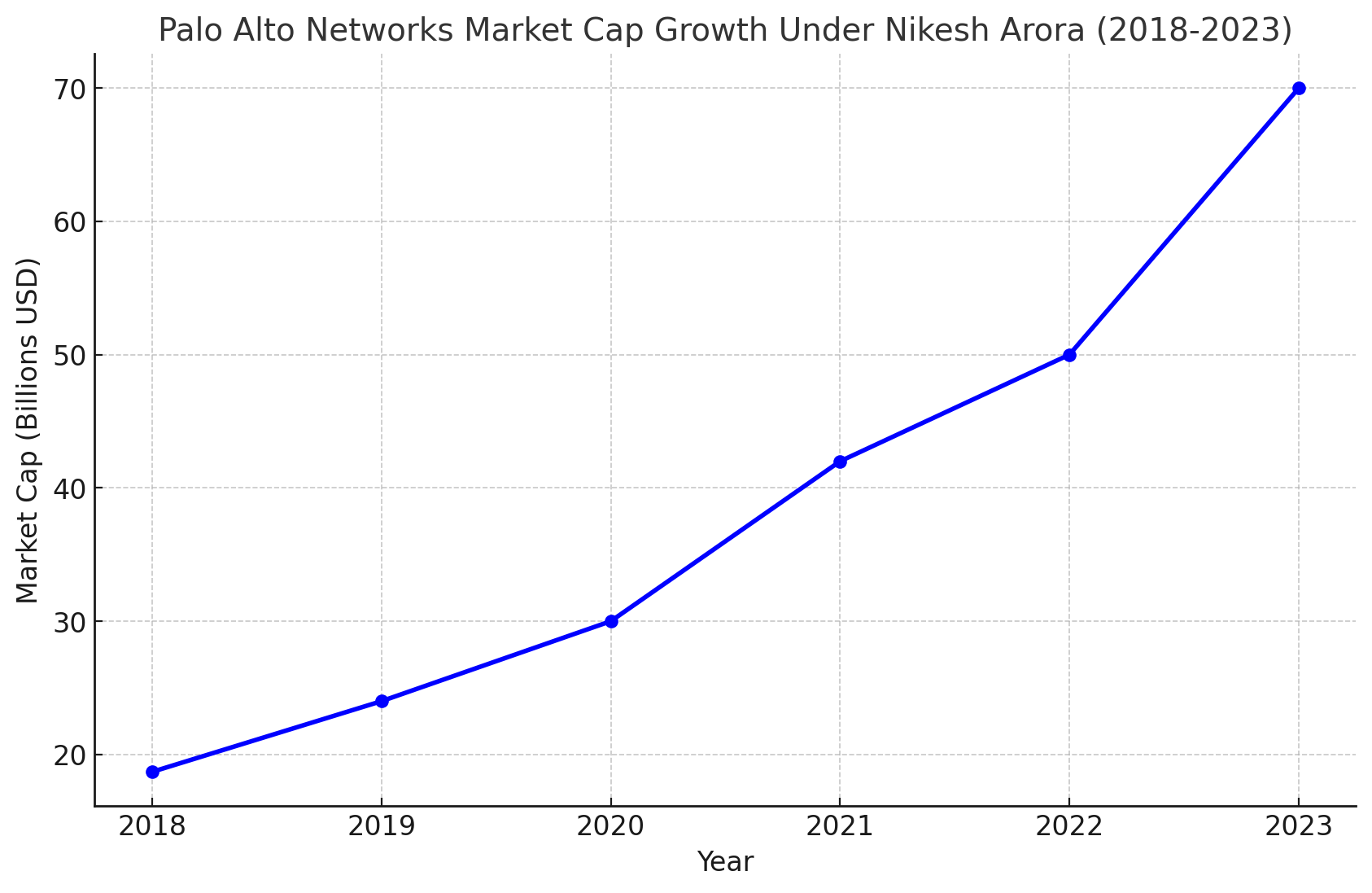 The market cap of PAN (currently ~$130B in Nov. 2024) has increased 6.5x since Arora took the reigns as CEO. The Cyber market has increased significantly, but PAN is outpacing their competitors by a significant margin…