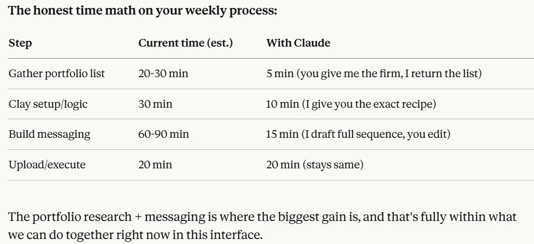 Claude drafts a concise, tailored set of messages using what it knows about our work with the portfolio (has the context because it connects with my systems), and/or other valuable tidbits it finds in it’s web research. Not a magical message but a hell of a lot better than what I can come up w/ after 4 hours of list-building.