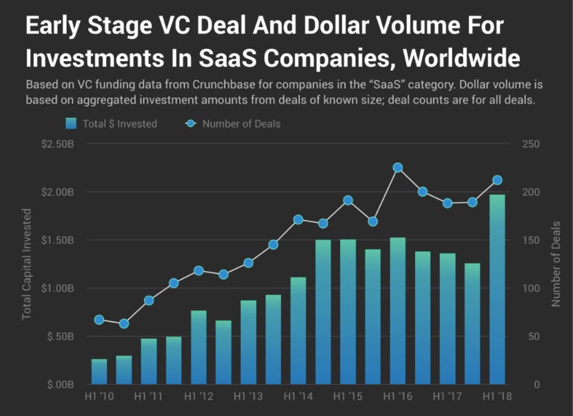 Due to the success of companies above, and VCs looking to bolster their portfolio with SAAS “hedges” to cover consumer products that don’t pan out, the amount of capital flooding the early-stage SAAS market over the past 5 years has been nothing short of awesome.