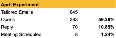 During the month of April I decided to run a little experiment, focusing the majority of my cold outreach efforts on highly-tailored first emails, with more generic phone/email follow up, vs. relying on the spam I was sending during Q1.