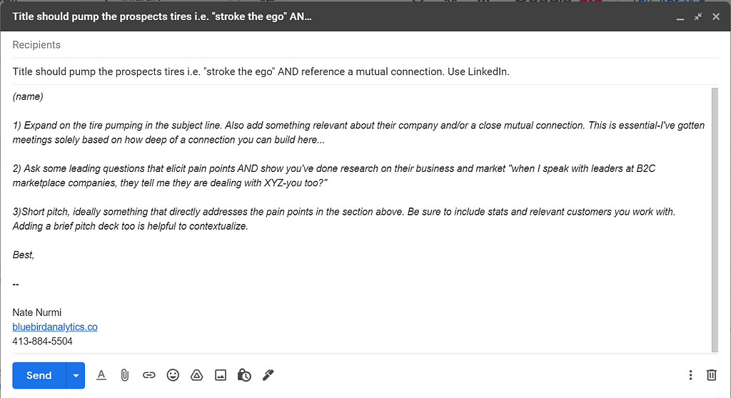 Subject Line/Part 1: This is the “hook” - show you’ve done research on them individually as well as their company. Even if it’s not a fit, the fact that you’ve put in effort will lead to many more opens and positive replies.